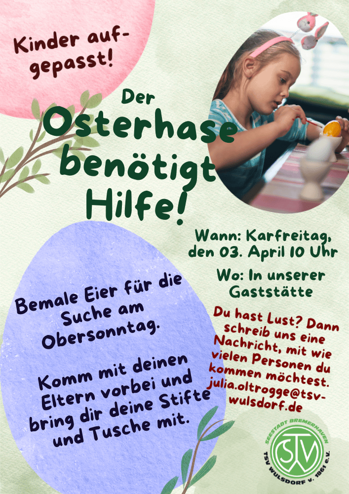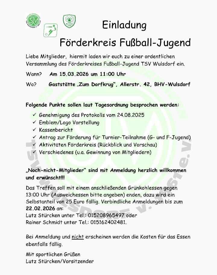 Einladung Förderkreis Fußball-Jugend Liebe Mitglieder, hiermit laden wir euch zu einer ordentlichen Versammlung des Förderkreises Fußball-Jugend TSV Wulsdorf ein. Wann? Am 15.03.2026 um 11:00 Uhr Wo? Gaststätte „Zum Dorfkrug“, Allerstr. 42, BHV-Wulsdorf Folgende Punkte sollen laut Tagesordnung besprochen werden: Genehmigung des Protokolls vom 24.08.2025 Emblem/Logo Vorstellung Kassenbericht Antrag zur Förderung für Turnier-Teilnahme (G- und F-Jugend) […]
