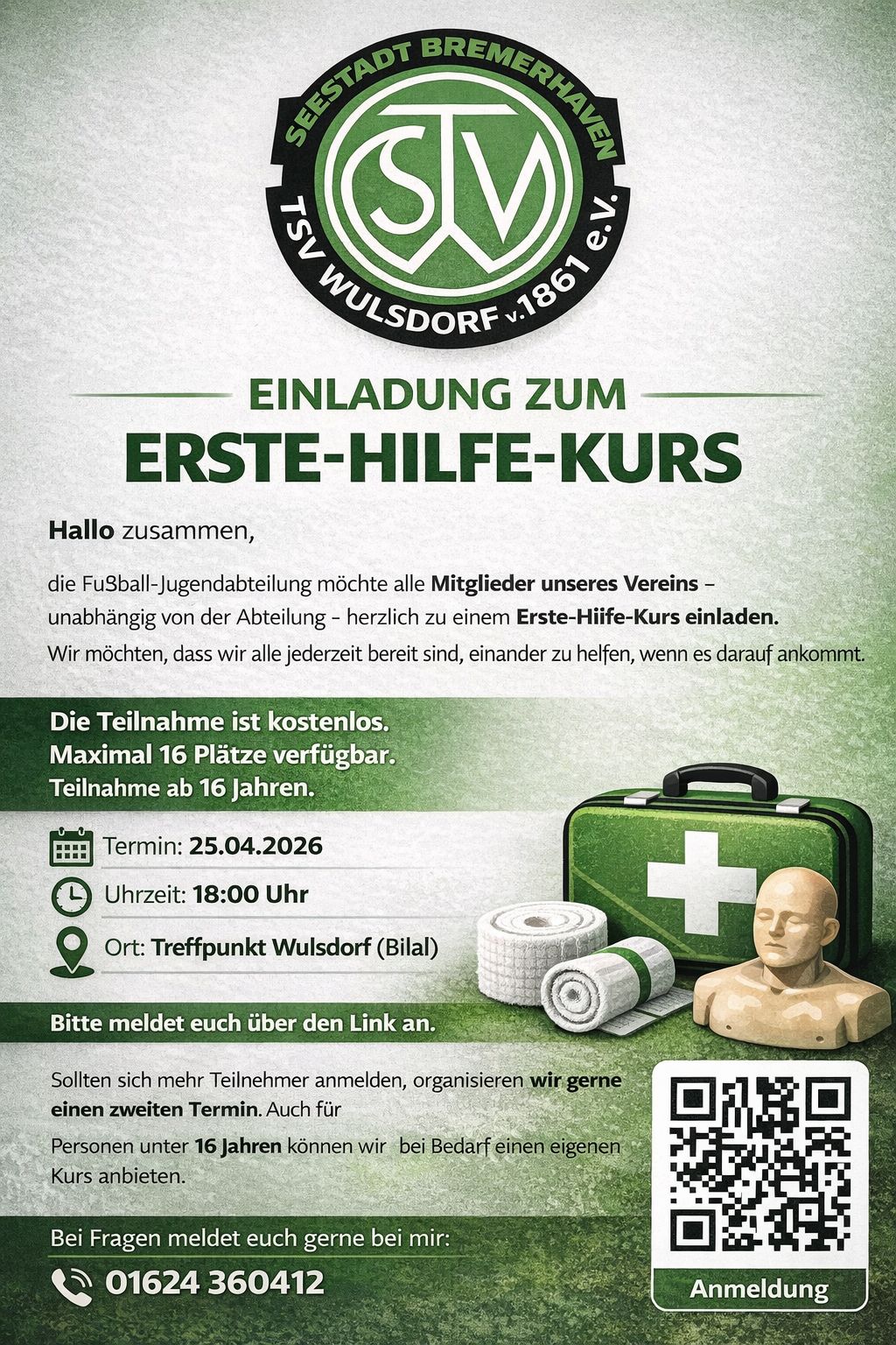 Einladung zum Erste-Hilfe-Kurs⛑️ Die Fußball-Jugendabteilung lädt zum kostenlosen Erste-Hilfe-Kurs für Mitglieder der TSV Wulsdorf ein. Wann: am Samstag, den 25. April 2026 um 18:00 Uhr in der Gaststätte der TSV Wulsdorf. Bitte meldet euch über den QR-Code oder dem Link https://forms.office.com/r/z3fu5hXHbe an. Teilnahme ab 16 Jahren möglich.